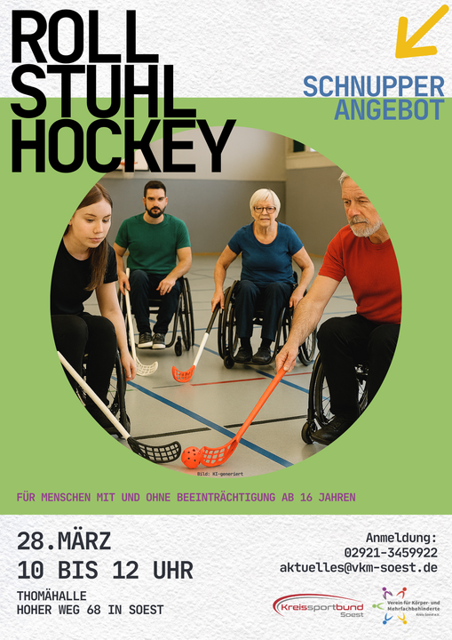 Der Verein für Körper- und Mehrfachbehinderte Menschen (VKM) und der Kreissportbund Soest laden alle Interessiertenab 16 Jahren herzlich zu einem kostenfreien Rollstuhlhockey-Schnupperangebot ein. Die Veranstaltung findet am 28. März 2026 von 10 bis 12 Uhr in der Thomähalle, Hoher Weg 68, in Soest statt.