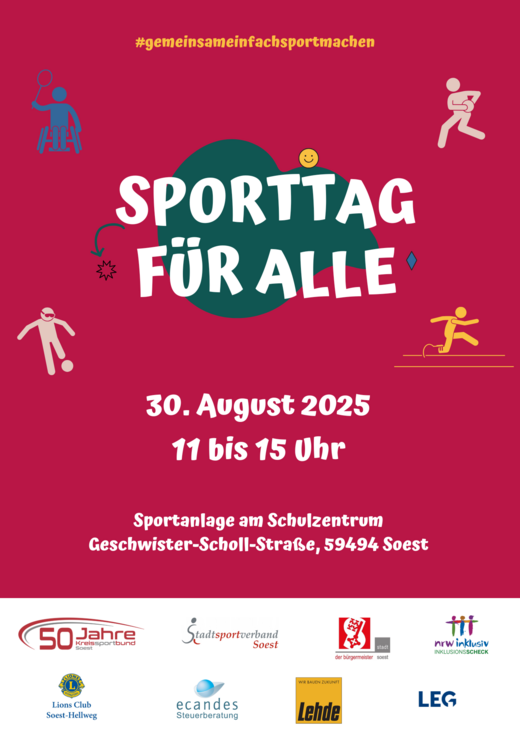 Schirmherr*innen der Veranstaltung sind Dr. Eckhard Ruthemeyer, Bürgermeister der Stadt Soest, zusammen mit Karina Granitza, Para-Bogenschützin des CFB Soest. Gemeinsam eröffnen Sie den Sporttag um 11 Uhr. Die Mitmachangebote starten direkt im Anschluss.